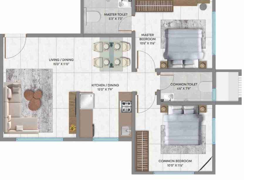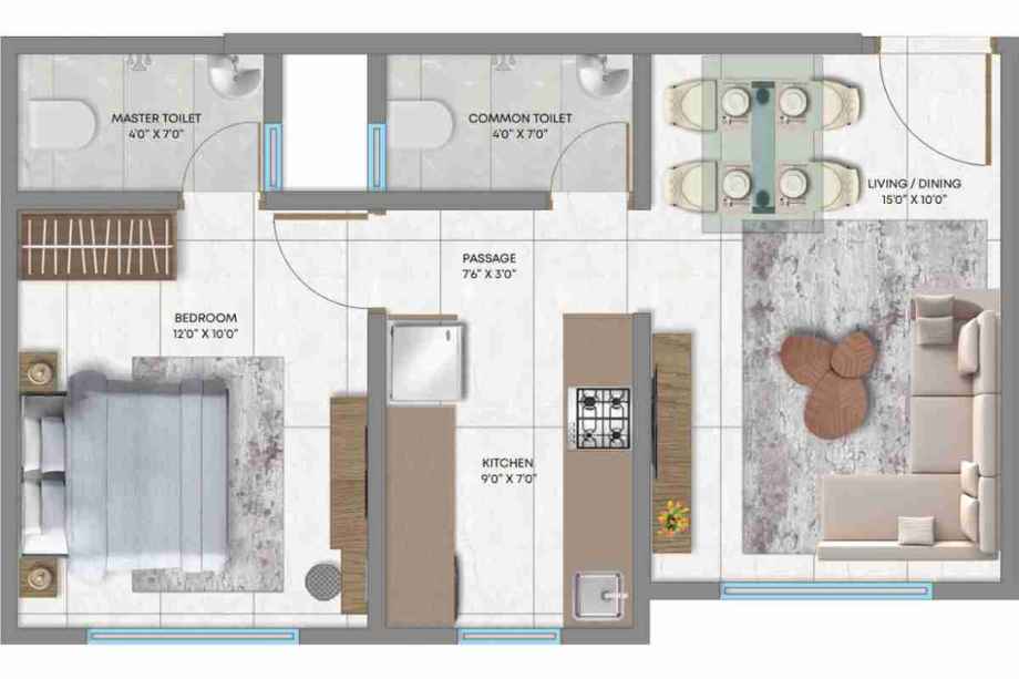 Crescent Silverwoods offers 1 BHK apartments with a carpet area of 431 sq.ft. and 2 BHK apartments ranging from 628 to 644 sq.ft.