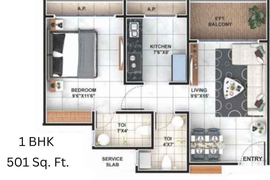 | 1 BHK | 501 sq. ft. | ₹35.00 Lac* | Unfurnished |