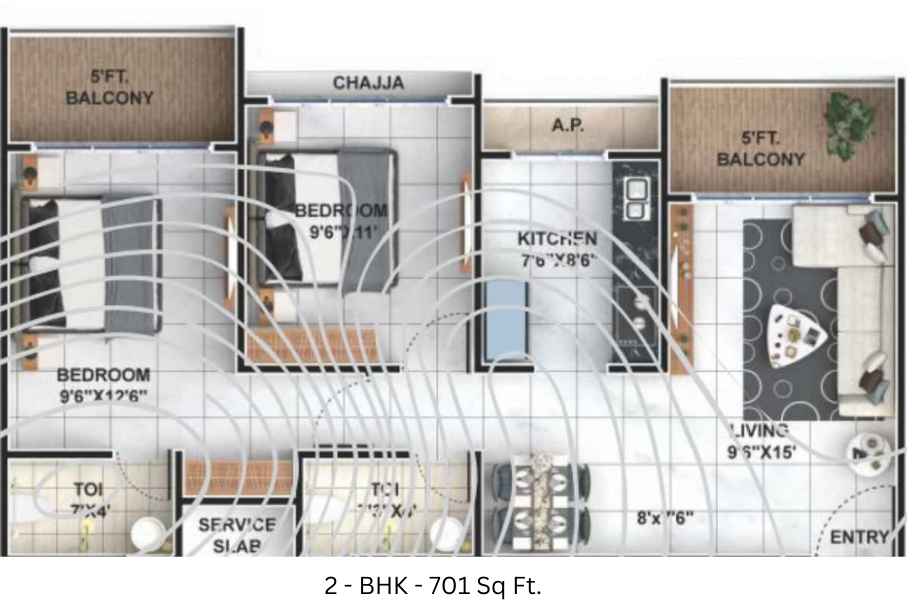 | 2 BHK | 701 sq. ft. | ₹49.00 Lac* | Unfurnished |