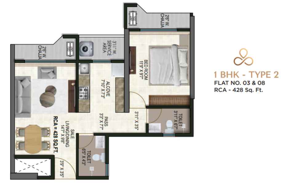| 1 BHK | 428 Sqft sq. ft. | ₹87.50 Lac* | Unfurnished |