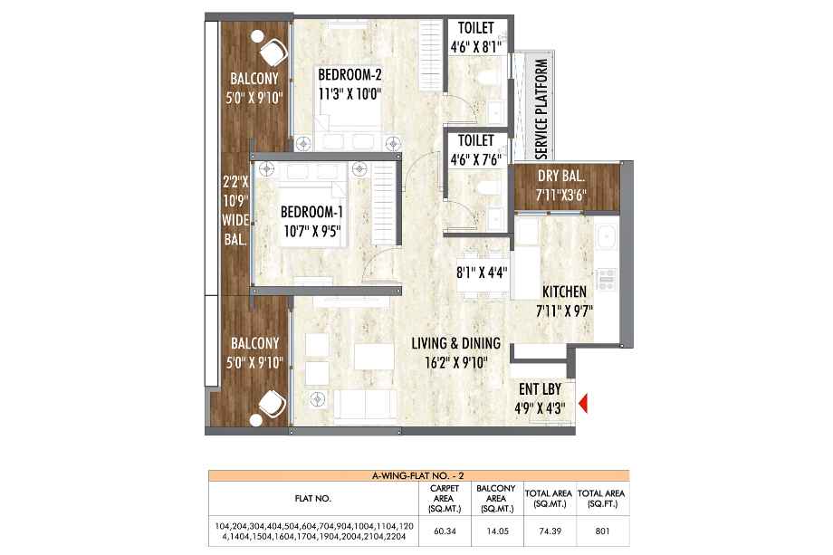| 2 BHK | 801 Sqft sq. ft. | Unfurnished |