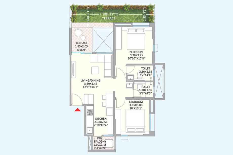 Little Earth offers 2 BHK apartments with carpet areas ranging from 816 to 1073 sq. ft. and 3 BHK apartments with carpet areas ranging from 1074 to 1336 sq. ft.