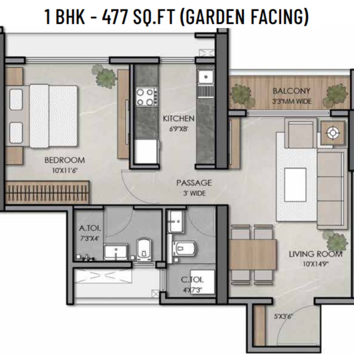 | 1 BHK | 477 Sqft sq. ft. | Unfurnished |
